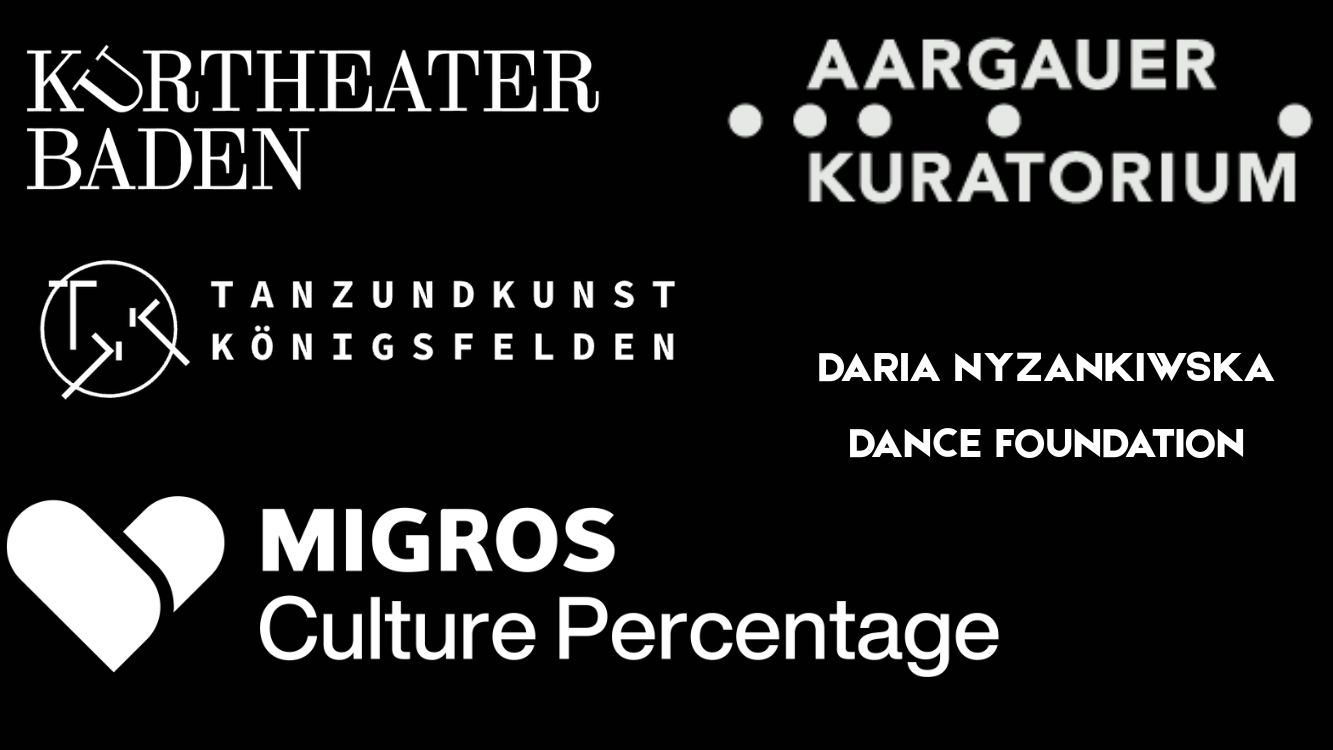 With thanks to Residenzzentrum Tanz+, Kurtheater Baden and Tanzhaus Basel for the residency space and support. With thanks to Migros Kulturprozent, Aargauer Kuratorium and the Daria Nyzankiwska Dance Foundation for supporting this research.